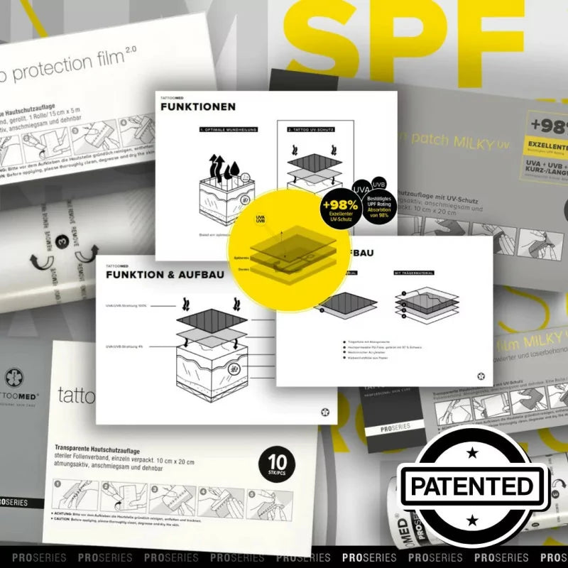 لفافة فيلم حماية الوشم من TattooMed بحجم 2م × 20سم هي حل طبي حاصل على براءة اختراع مصمم لتوفير حماية ورعاية فائقة للجلد الموشوم حديثًا - خاصة خلال أشهر الصيف. بفضل السطح المبتكر MILKY، يحجب هذا الفيلم 98% من جميع أشعة UVA وUVB، مقدمًا حماية شمسية ممتازة مصنفة UPF عندما يكون وشمك الجديد في أشد حالات الضعف.