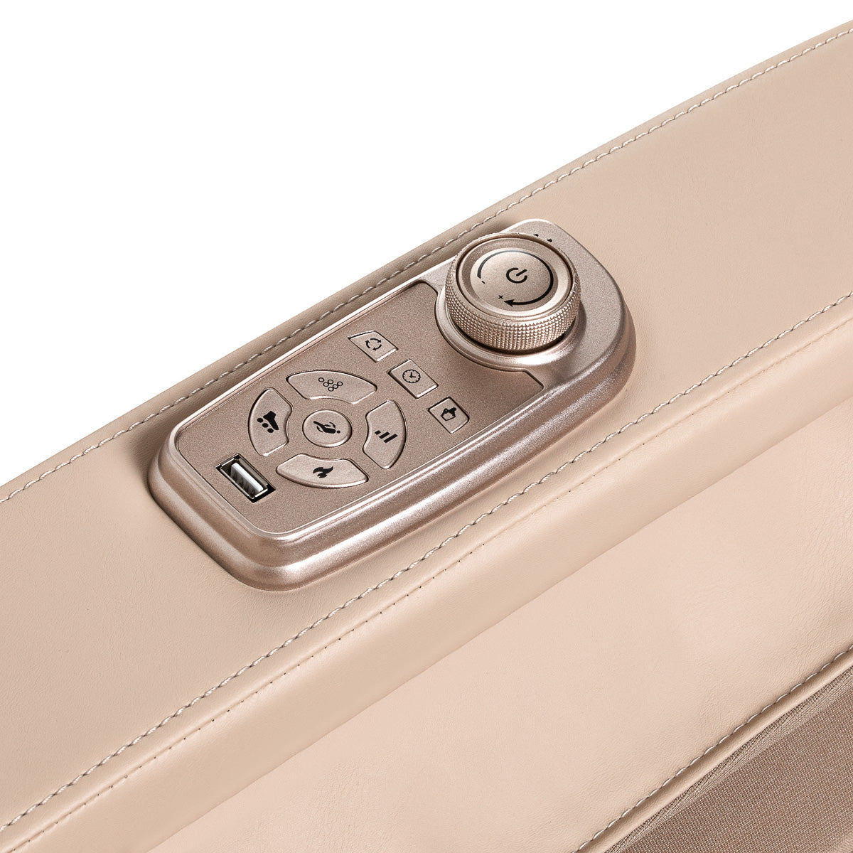 لراحة أكبر، تم تجهيز الكرسي بمجموعة أزرار تحكم مدمجة في مسند الذراع الأيسر. يتيح هذا التحكم السريع الوصول إلى أهم الوظائف دون الحاجة للوصول إلى اللوحة الرئيسية. يمكن استخدامه لـتغيير وضع التدليك بسهولة، بدء تدليك القدم أو تفعيل وضع الجاذبية الصفرية – كل ذلك مع أقصى درجات الراحة والاسترخاء التام. كما يحتوي على منفذ USB يسمح بشحن الهاتف أثناء التدليك.