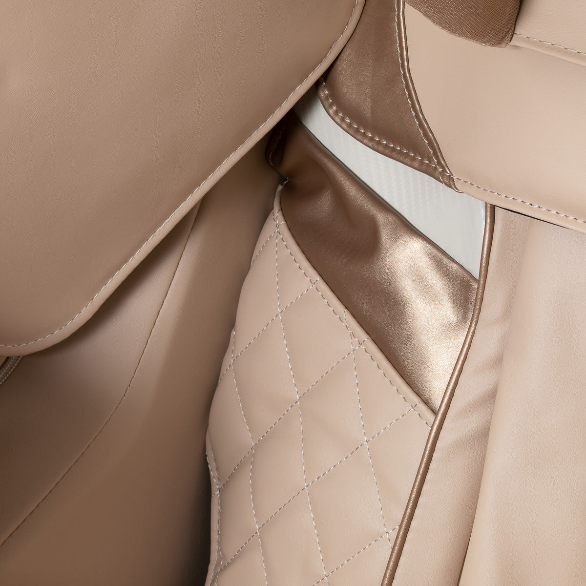 الجلد الصناعي الناعم بدرجات البيج يوفر راحة استثنائية في الاستخدام وسهولة التنظيف. هذه المادة ليست فقط جذابة من الناحية الجمالية، بل مقاومة للرطوبة، مما يزيد من وظيفتها. العناصر الخارجية باللون الذهبي الوردي مع تشطيب هيكلي بدرجات الأبيض تعطي الكرسي مظهرًا عصريًا وأنيقًا. الشكل المدمج والألوان الهادئة تجعل الموديل يندمج بتناغم مع تصاميم داخلية متنوعة. ساكورا برايم 108 هو خيار ممتاز للأشخاص الباحثين عن الاسترخاء اليومي – خاصة بعد يوم مكثف أو جهد بدني متطلب.