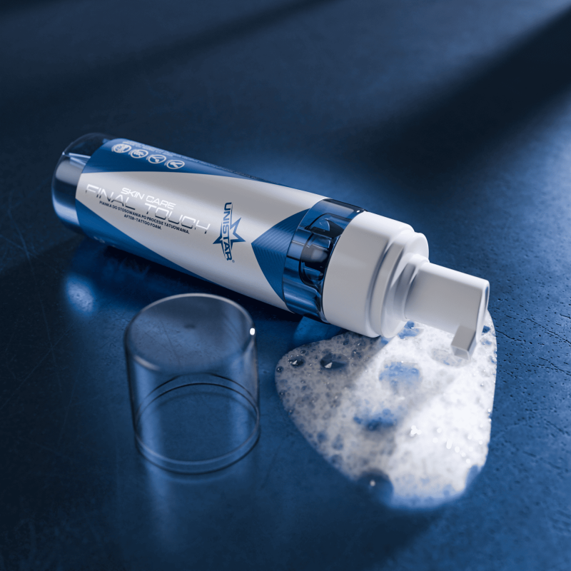 رغوة Unistar للعناية بالبشرة Final Touch هي منظف رغوي احترافي تم تطويره للمرحلة النهائية من عملية الوشم. يزيل بقايا الحبر، الفازلين، والمنتجات الأخرى دون الإضرار بالحاجز الدهني المائي الطبيعي للجلد.