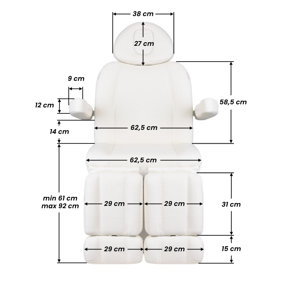 كرسي تجميل كهربائي فريد من نوعه، مناسب تمامًا لصالونات التجميل وسبا. بفضل المحركات المستقلة، يسمح لك بتعديل الكرسي في 3 محاور عن طريق جهاز تحكم عن بعد ومفاتيح قدم، مما يتيح إمكانية إجراء علاجات باديكير مريحة بالإضافة إلى علاجات الوجه والجسم. باستخدام جهاز التحكم عن بعد، يمكننا استخدام الإعدادات المبرمجة وتشغيل وظيفة التسخين HOT. يستخدم الكرسي تنجيدًا مثقوبًا، وهو أمر غير مألوف في الكراسي الأخرى، وإضاءة LED ملونة في القاعدة.