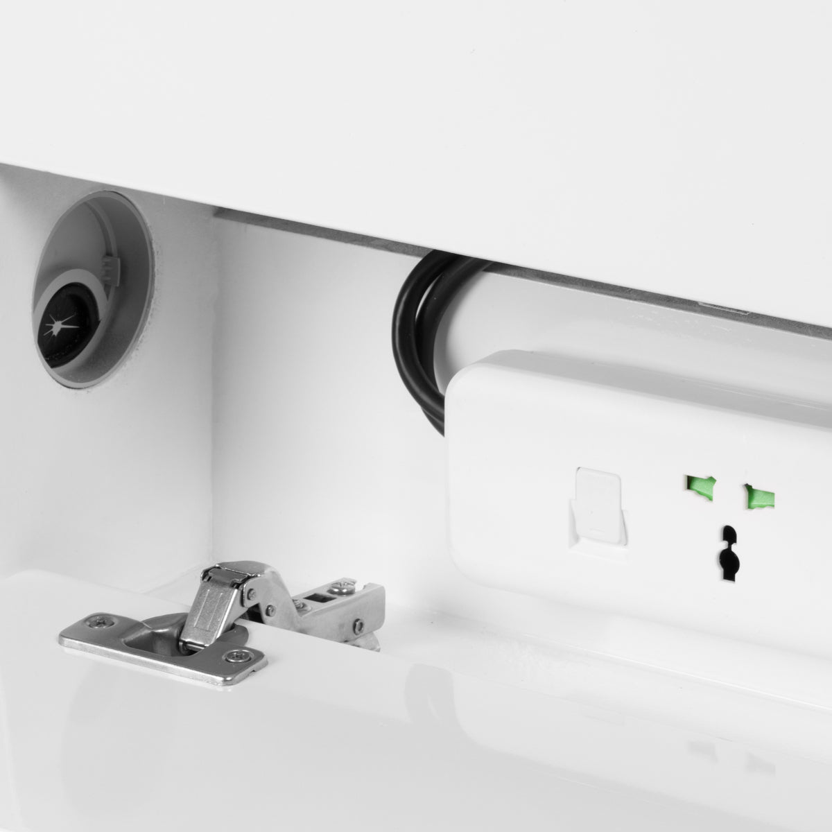 مساعد تقويم الأقدام عالي الجودة هو قطعة أثاث تجميلية وظيفية على عجلات. بفضل قابليتك للحركة، يمكنك نقله إلى غرف علاج أخرى. يحتوي المساعد على سطح عمل زجاجي، وأدراج للأدوات والإكسسوارات ورف لجهاز طحن تقويم الأقدام أو جهاز آخر. يحتوي أحد الأدراج على مصباح UV-C مدمج لتعقيم أفضل للأدوات والإكسسوارات.