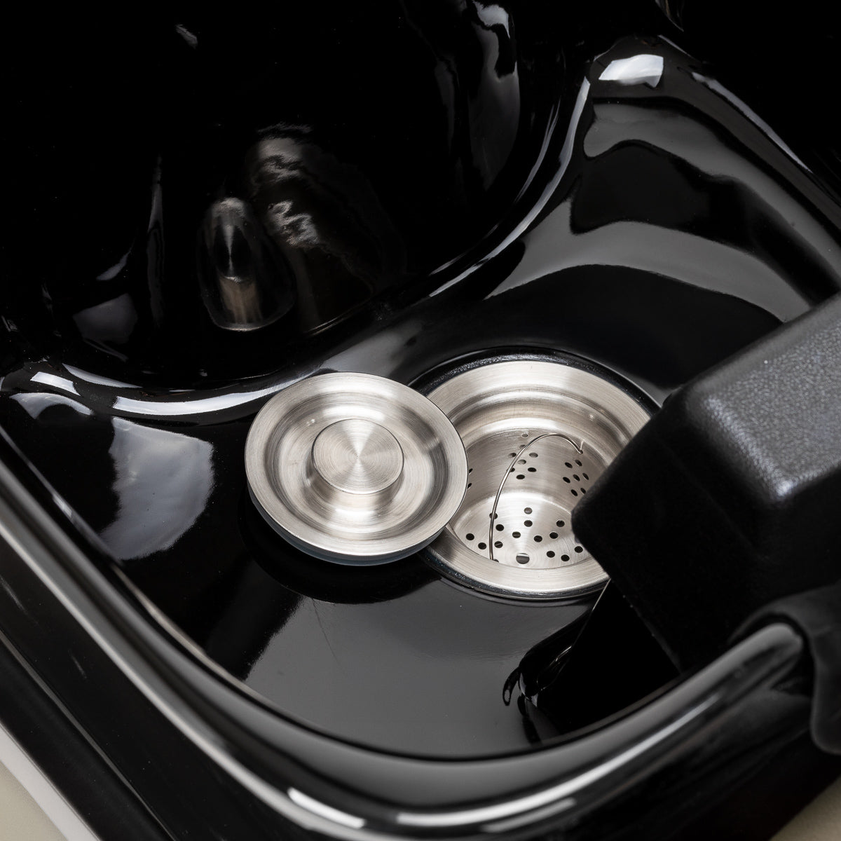 الحوض الخزفي بدرجات اللون الأسود، بشكله العصري وعمقه المناسب، يمنع بفعالية تناثر الماء والمنتجات المستخدمة أثناء العلاجات، مما يسمح بأداء مريح وفعال لمجموعة واسعة من الخدمات. يوفر الطوق المصمم بشكل مناسب ومسند الظهر المائل الراحة والدعم أثناء غسل الشعر، بينما يحمي الغطاء البلاستيكي الأسود العميل من سطح الخزف البارد، مضمنًا تجربة ممتعة أثناء العلاج.