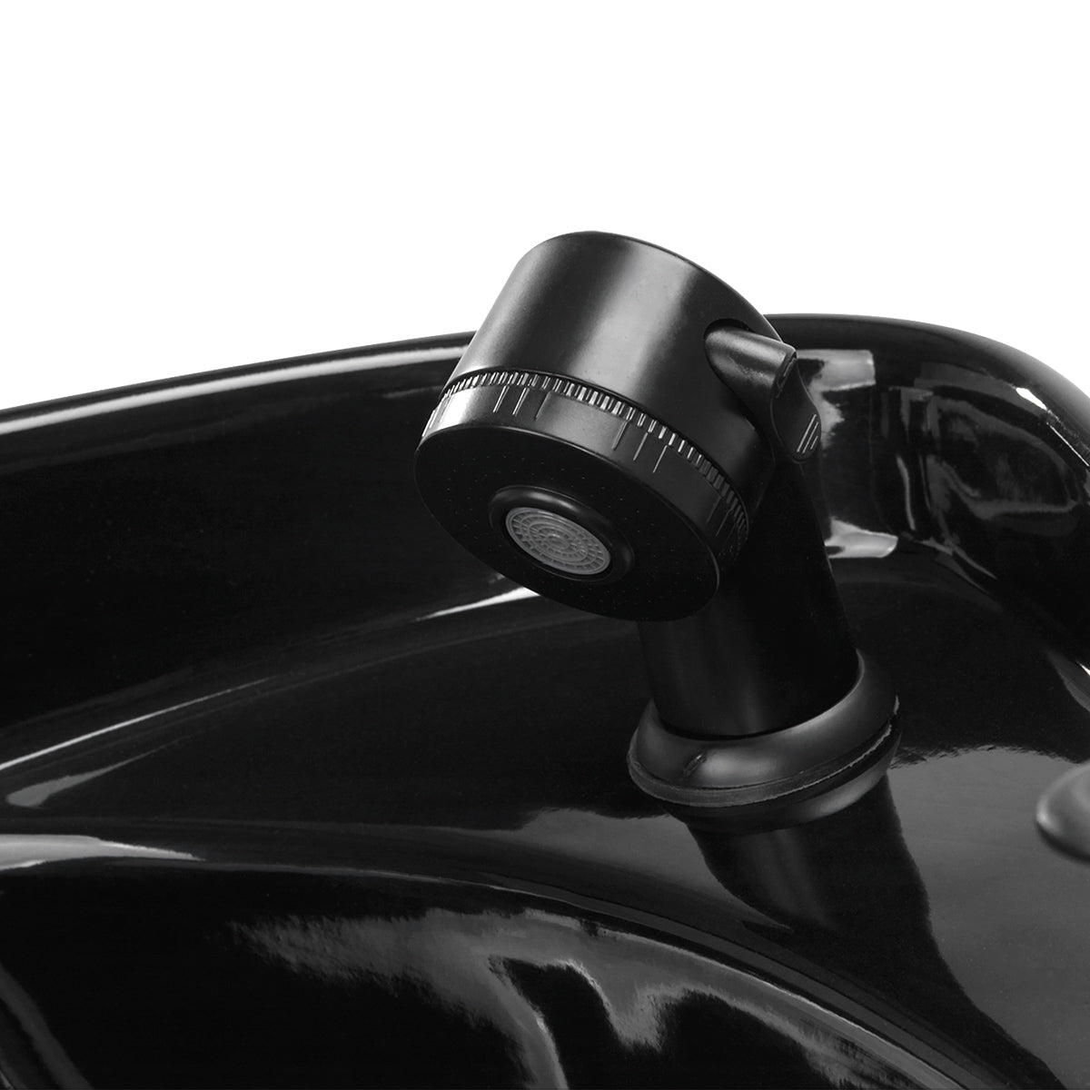 حوض الغسيل السيراميكي الأسود ذو العمق المناسب يمنع تناثر الماء والمنتجات المستخدمة أثناء العلاج بشكل مفرط، مما يسمح بـ أداء مريح لمجموعة واسعة من الخدمات. إمكانية ضبط زاوية الحوض تسمح بـ تكييف الإعداد حسب الاحتياجات الفردية. المادة المستخدمة تجعل الحوض متينًا، مقاومًا للبقع والخدوش، وسهل التنظيف جدًا. الطوق المصمم بشكل صحيح يوفر الدعم والراحة أثناء غسل الشعر، ومع الغطاء البلاستيكي المريح، لن يشعر العميل بعدم الراحة المرتبطة بسطح السيراميك البارد.