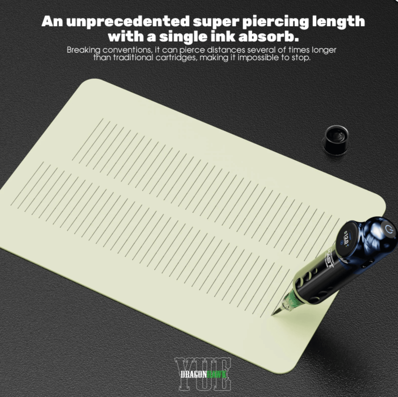 - طول اختراق غير مسبوق: متجاوزة الحدود التقليدية، توفر خراطيش YUE طول اختراق غير مسبوق مع امتصاص حبر واحد. تتيح هذه الابتكارات مسافات وشم ممتدة دون انقطاع، مما يعزز الكفاءة في سير العمل.