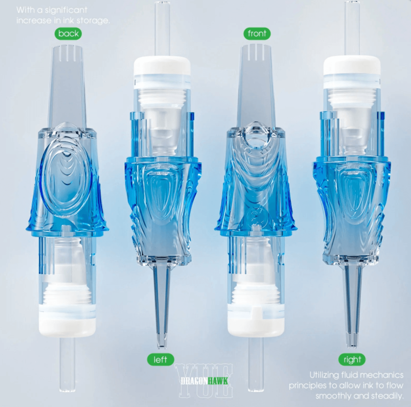 - خطوط انسيابية مريحة: مستوحاة من جمال المياه المتماوجة، تعزز الخطوط الانسيابية للخراطيش راحة القبضة، مما يضمن سهولة الاستخدام خلال جلسات الوشم الطويلة. يسمح هذا التصميم المريح للفنانين بالحفاظ على السيطرة دون التضحية بالراحة.