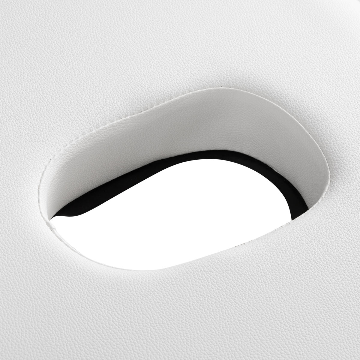 لضمان أقصى درجات الراحة، يمكن للشخص الذي يستخدم الطاولة أن يستند برأسه على مسند الرأس المريح، المرفق في المجموعة. هذا العنصر سهل التعديل – يسمح بضبط الزاوية في مستويين، مما يجعل من الممكن ضبط موقعه بدقة حسب احتياجات المستخدم وطبيعة العلاج المُجرى. للعلاج على الظهر، يمكن إزالة مسند الرأس، باستخدام فتحة خاصة في سطح الطاولة بدلاً منه. وعندما لا يكون قيد الاستخدام، يمكن تغطية الفتحة بالقابس المرفق، مما يعيد السطح إلى مظهر جمالي وموحد.