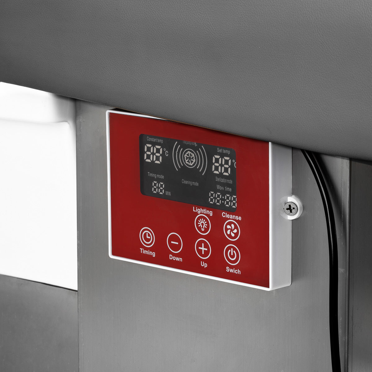 لوحة اللمس البديهية توفر تحكمًا كاملاً في وظائف وحدة الغسيل. تتيح ضبط وقت التشغيل ودرجة حرارة الماء، بالإضافة إلى مراقبة القيم الحالية. بفضل الشاشة المدمجة، يمكنك التحقق من مدة تشغيل الجهاز في أي وقت. تتيح اللوحة أيضًا تفعيل وظيفة العلاج الضوئي، أي إضاءة الحوض، مما يخلق جوًا من الاسترخاء والفخامة. بالإضافة إلى ذلك، جهاز علاج البخار مزود بجهاز تحكم عن بعد، مما يتيح تشغيلًا مريحًا عن بُعد.