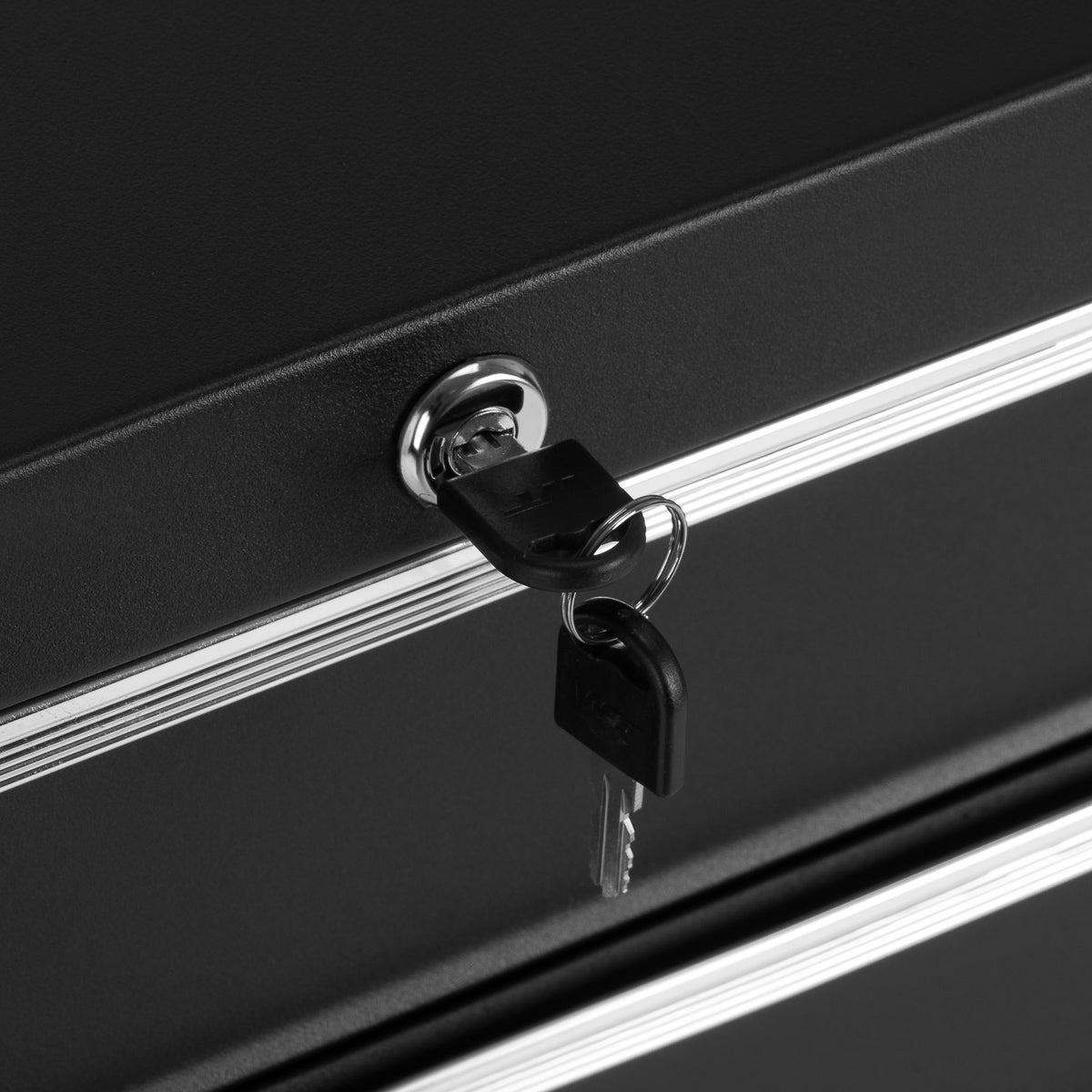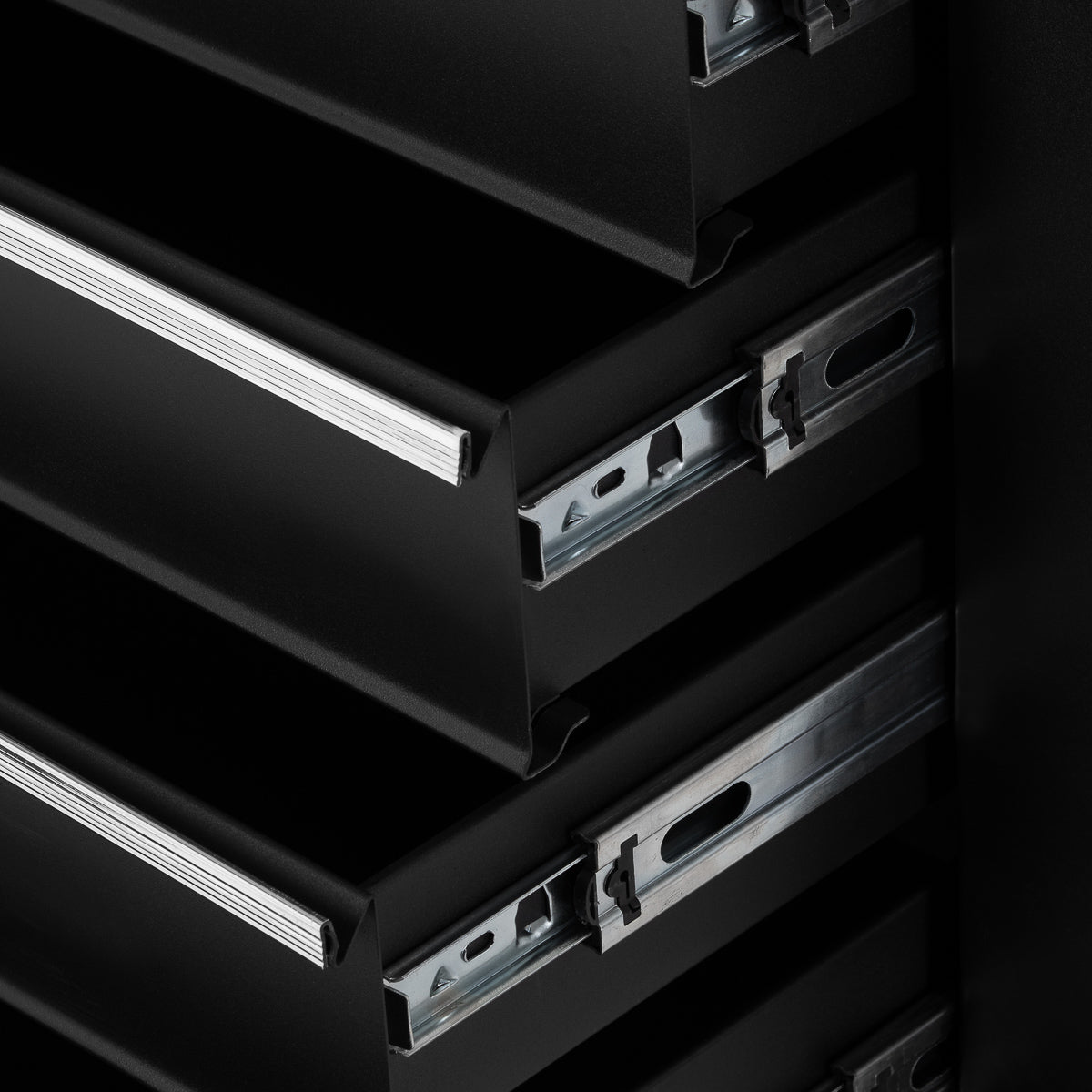 النموذج مزود بـ خمسة أدراج واسعة، مما يوفر مساحة كبيرة للأدوات الضرورية، ومنتجات النظافة والإكسسوارات ذات الاستخدام الواحد. التخطيط المدروس جيدًا يعزز النظام والتنظيم المناسب لمساحة العمل. قفل رئيسي يمنع سحب الأدراج بشكل غير مراقب ويسمح بتخزين الأدوات الحساسة أو الوثائق.