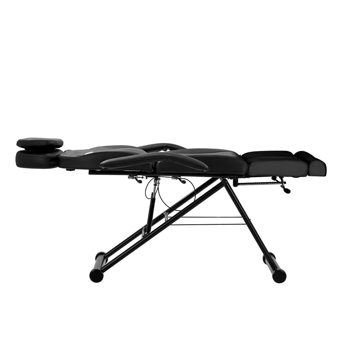 قاعدة الكرسي ذات ارتفاع ثابت، لذا يكون المقعد على مستوى ثابت، مما يضمن الراحة أثناء الاستخدام. يوفر الإطار المعدني الصلب بدرجات اللون الأسود الثبات اللازم أثناء الاستخدام. يوفر مسند الرأس، الذي يمتد حوالي 15 سم، دعمًا ممتازًا للرأس، بغض النظر عن طول العميل. هذا يسمح بأداء أنواع مختلفة من العلاجات، بما في ذلك التجميل، العلاج الطبيعي والوشم بحرية.