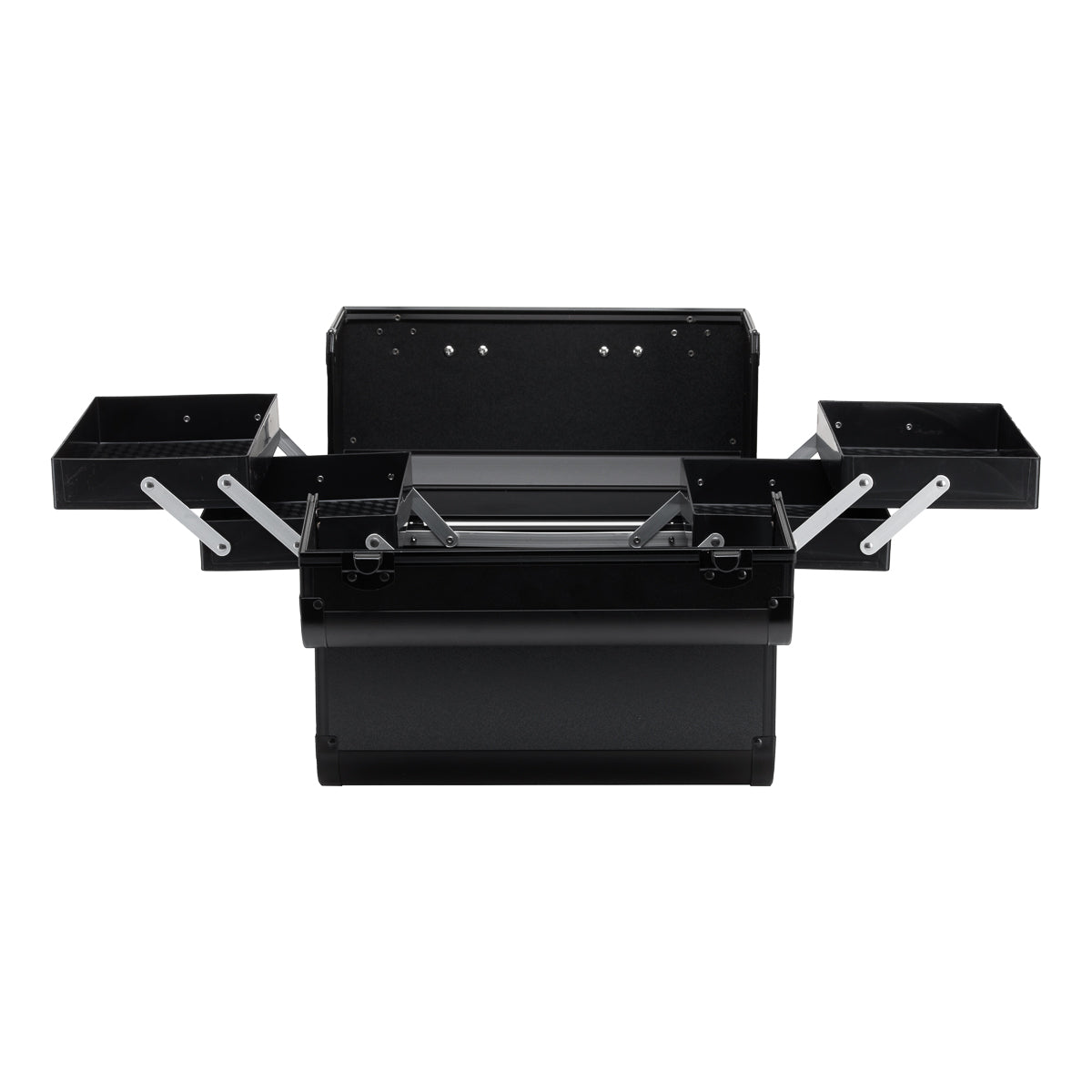 يضيف التصميم العصري مع الجدران السوداء الملساء والتفاصيل المعدنية لمسة من الأناقة. تسهل المقبض عملية النقل، وهو أمر مهم بشكل خاص للمصففين المتنقلين. مصنوع من مواد متينة مقاومة للتلف، يضمن راحة الاستخدام اليومية. يحافظ قفل الإغلاق المتين مع مفتاح على حماية المحتويات، بينما تجعل البنية خفيفة الوزن والمتينة الحقيبة سهلة الحمل.