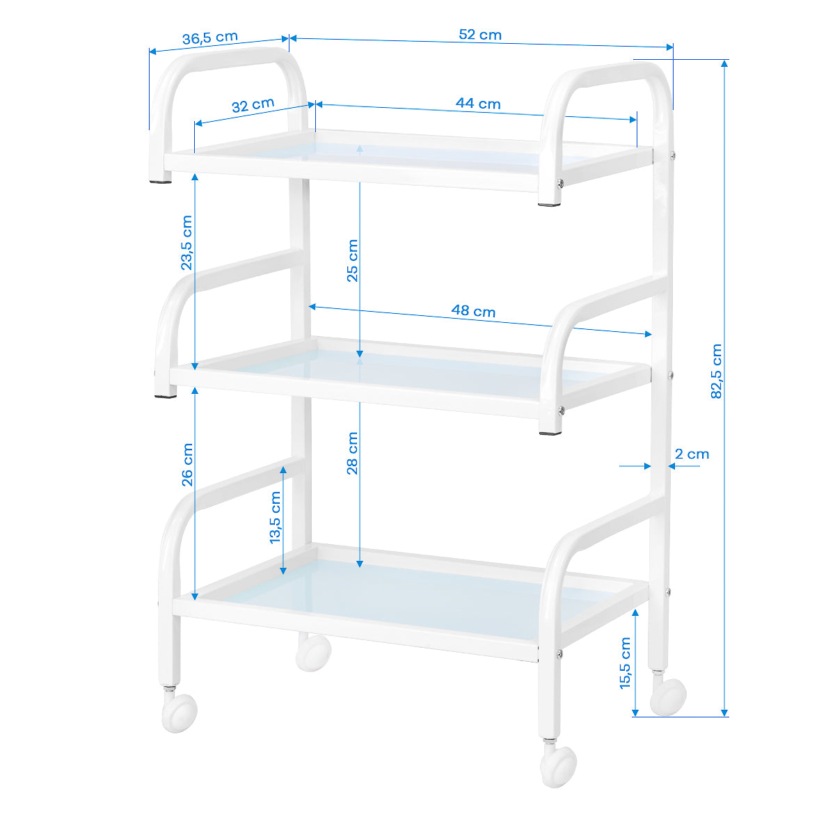 الإطار المصنوع من الألمنيوم المتين بدرجات اللون الأبيض والرفوف الزجاجية تخلق كلية عصرية وجميلة يسهل الحفاظ على نظافتها. أربع عجلات تضمن التنقل لتنظيم مساحة العمل بسهولة، بينما تضمن المواد المتينة الثبات وطول مدة الاستخدام.