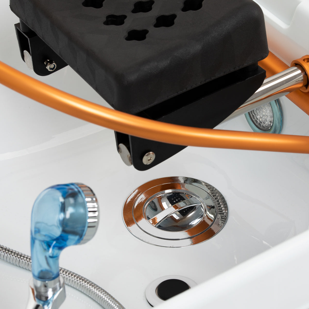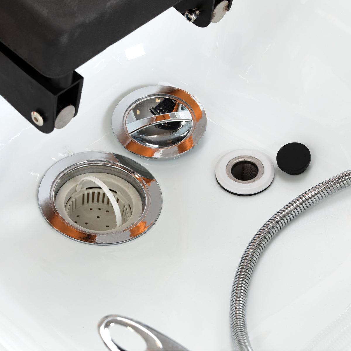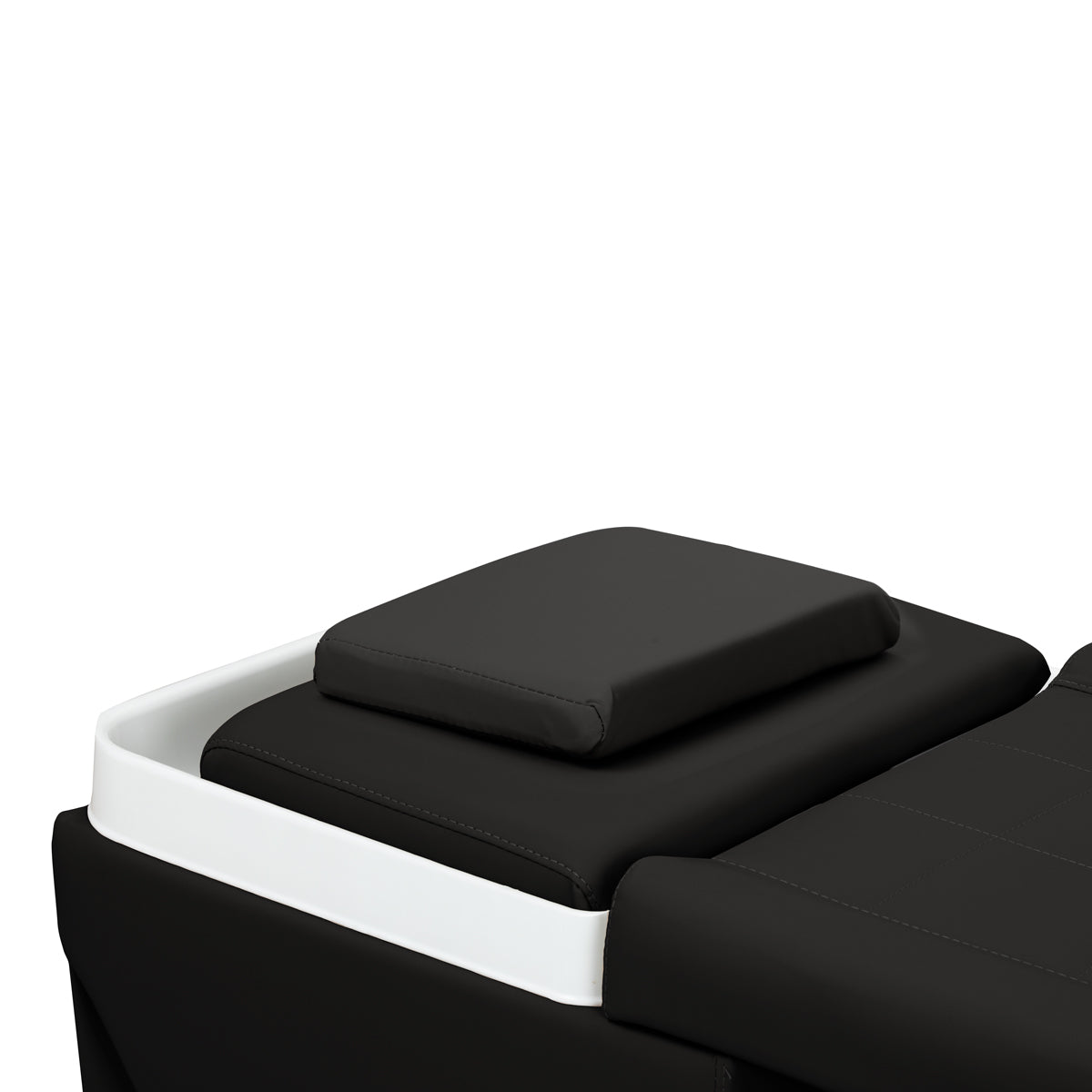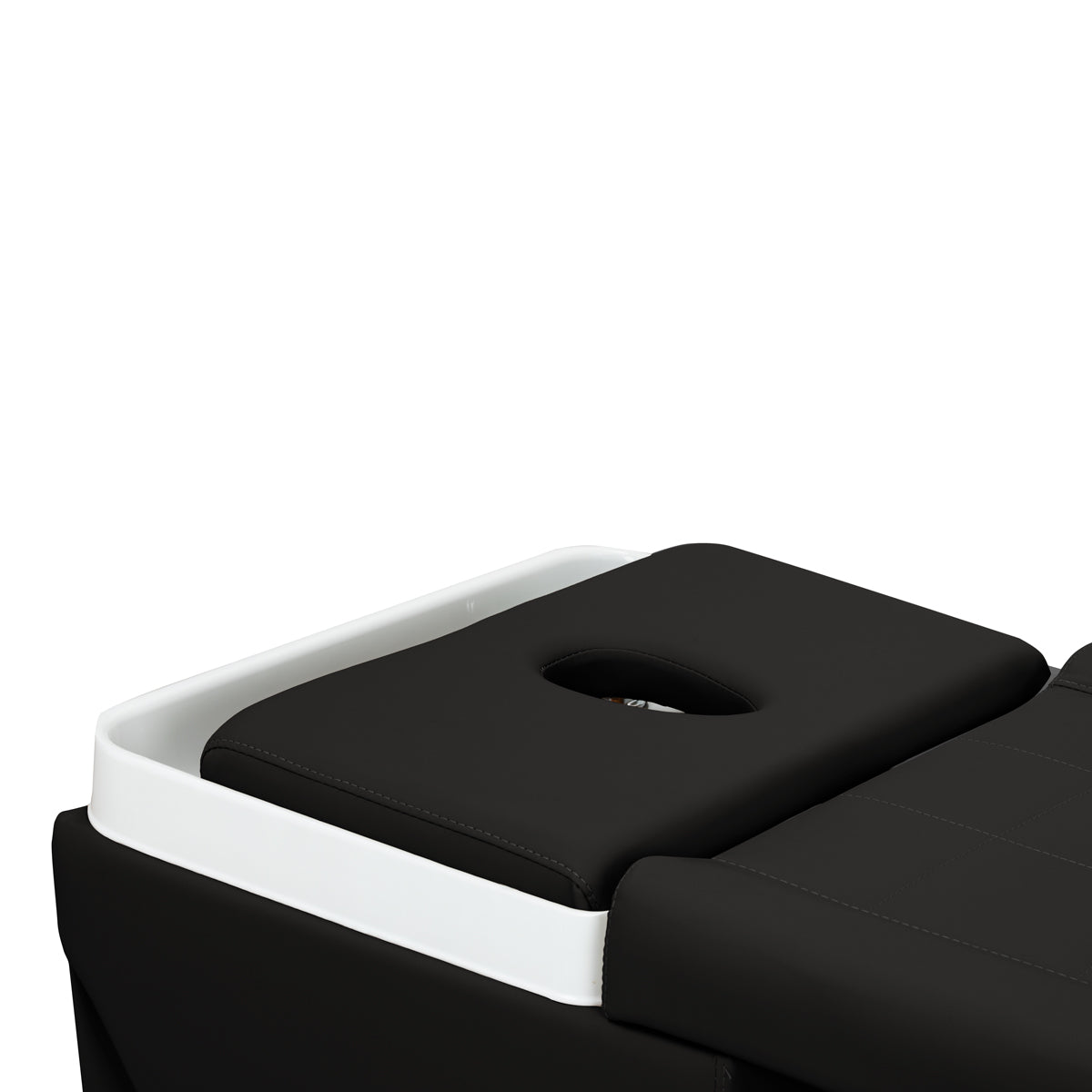 تحتوي وحدة الغسيل على صنبور خلاط، يسمح بـ ضبط دقيق لدرجة حرارة الماء حسب حاجة الزبون. مساحة مخصصة لرأس الدش تحسن الكفاءة، بينما يضمن سدادة مطلية بالكروم مع مصفاة خاصة التحكم في تدفق الماء والحفاظ على مستوى عالٍ من النظافة. يقع توصيل الماء داخل القاعدة، خلف القماش، مخفيًا أنابيب المياه بشكل جمالي ويمنح الوحدة مظهراً أنيقاً. السرير المصمم بشكل مريح يضمن الراحة أثناء مختلف علاجات الجمال. مقعد عملي يكمل الوحدة، معززاً راحة العاملين ومزيداً من الوظائف للوحدة. هذه الميزات تجعل وحدة الغسيل مثالية لكل من صالونات الشعر والسبا.