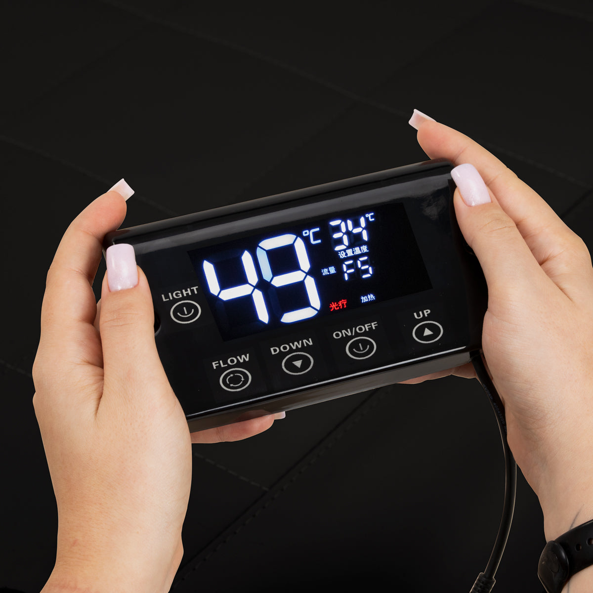 لوحة اللمس البديهية تتيح التحكم الكامل في معايير العلاج وسهولة الاستخدام. تسمح بضبط مدة التشغيل ودرجة حرارة الماء، بالإضافة إلى مراقبة القيم الحالية على شاشة واضحة وسهلة القراءة. بالإضافة إلى ذلك، تتيح اللوحة تفعيل وظيفة العلاج بالضوء التي تضيء الحوض، مُنشئة جوًا من الاسترخاء والفخامة. تتضمن المجموعة أيضاً جهاز تحكم عن بعد، يتيح التحكم المريح بجهاز العلاج بالبخار عن بُعد.