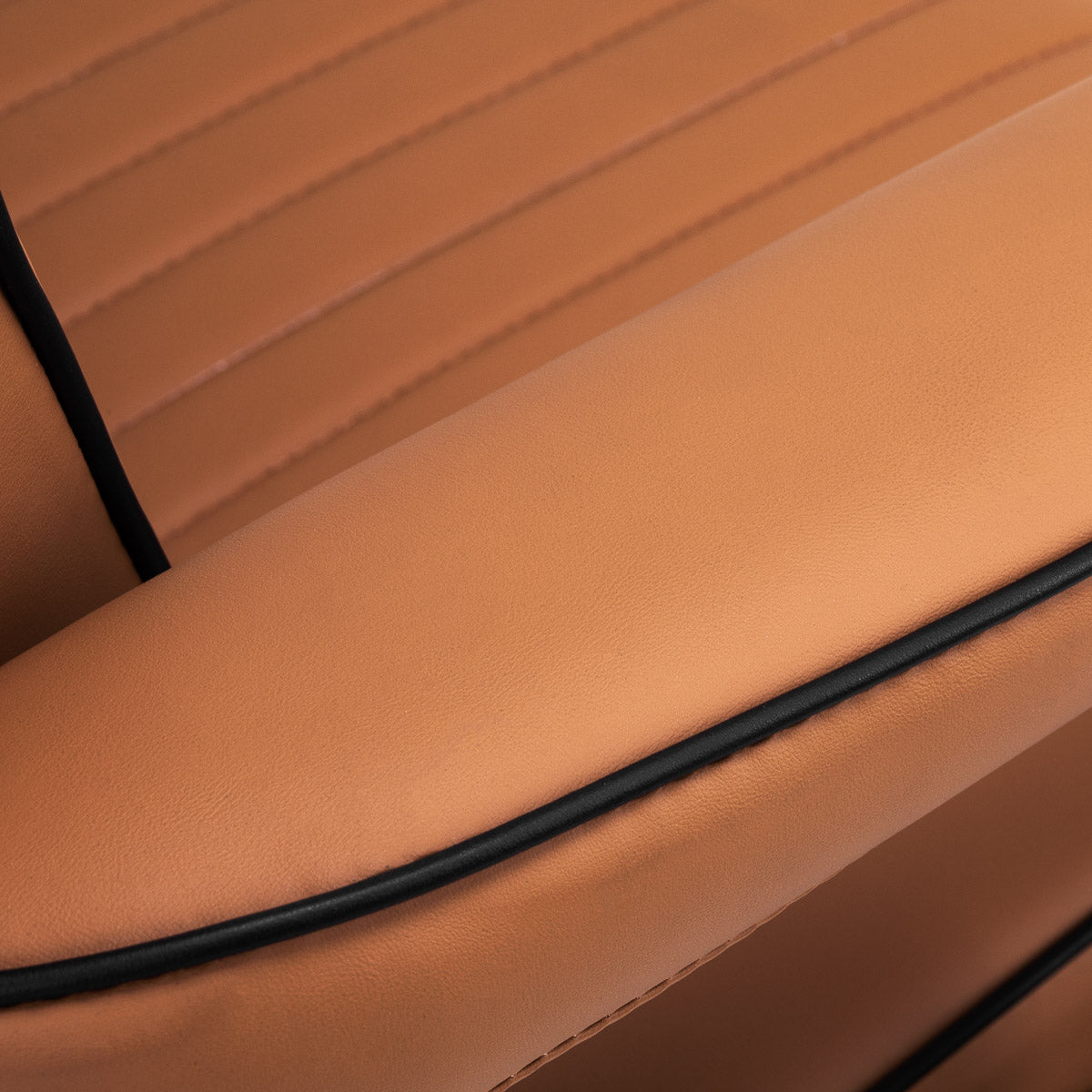 تصميم قاعدة متين يضمن الاستقرار وراحة عالية. المقعد مملوء برغوة مقاومة للتشوه ومبطن بجلد صناعي ناعم وناعم الملمس، يجمع بين المتانة والراحة. المواد المستخدمة في التشطيب مقاومة للرطوبة، متينة وسهلة التنظيف، مما يجعل الكرسي مثاليًا للاستخدام اليومي. الخياطة الأنيقة والتنجيد بدرجات البني تعطيه طابعًا فريدًا، يتناغم تمامًا مع ديكور صالونات الحلاقة الحديثة.