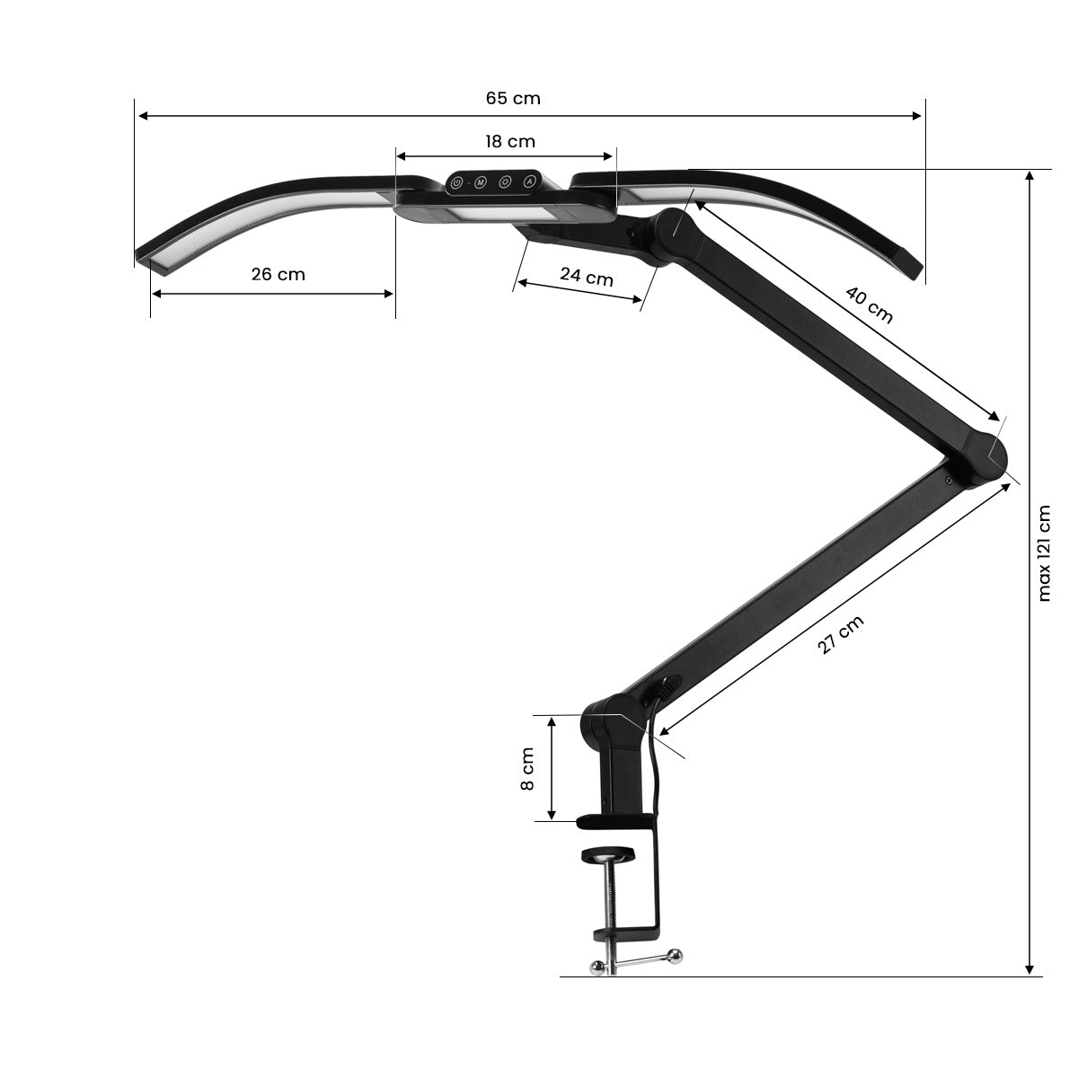 تجذب الشكل النحيف والهندسي للمصباح الانتباه بمظهره العصري والخلود في الوقت نفسه. يمنح نظام الألوان الأبيض مع التشطيب غير اللامع التصميم طابعًا أنيقًا واحترافيًا يتناسب تمامًا مع الديكورات الداخلية البسيطة لصالونات التجميل. يمكن التثبيت على سطح الطاولة بفضل مشبك يشبه الكماشة بفتح أقصى يبلغ 6.3 سم، وهو مناسب لمعظم أسطح الطاولات. يشكل كل ذلك قطعة متناسقة وجمالية من المعدات تجمع بين الوظائف العالية والتصميم الراقي.
