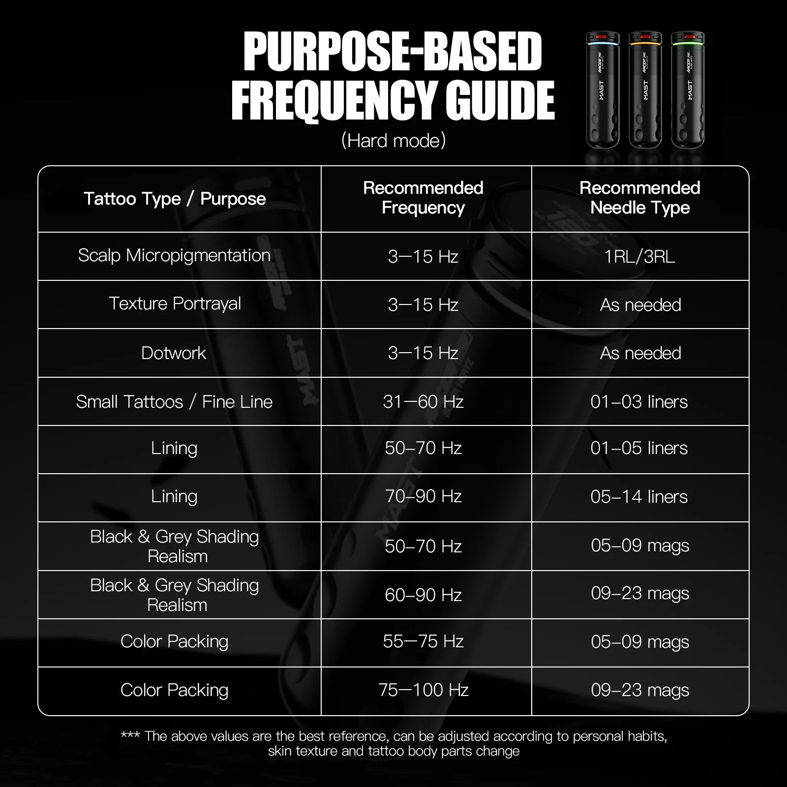 وضع التردد (3–140 هرتز) يزامن حركة الإبرة مع حركة اليد للتحكم السريع والثابت - مع إعدادات ناعمة، متوسطة، صلبة، ونقطية لأداء مخصص.
