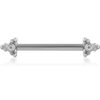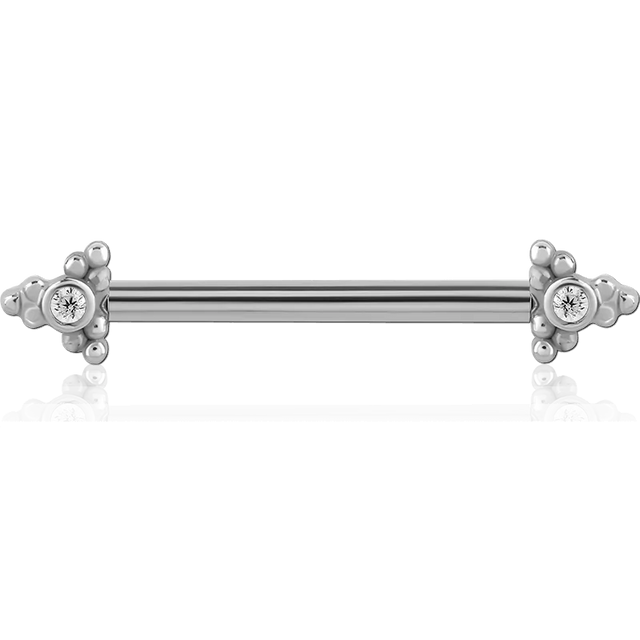 يتميز قرط ثقب الحلمة على شكل سهم بتصميم باربل مستقيم مصنوع من فولاذ جراحي 316L المصقول، مع شكل مستوحى من السهم ولمسة كريستالية دائرية شفافة. يضيف التفصيل الحاد والرسومي شخصية، بينما يحافظ الكريستال الشفاف على مظهر عام أنيق ومتوازن.