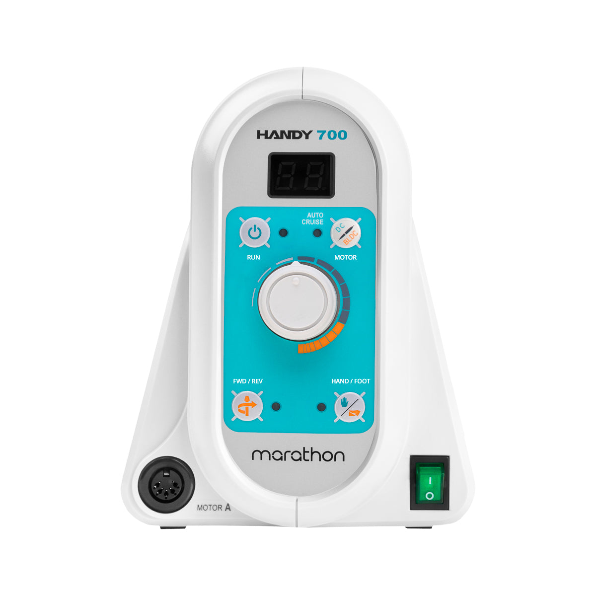 تقدم آلة حفر الأظافر Handy 700 قوة عالية تبلغ 100 واط وتشغيل هادئ. توفر سرعة عالية تصل إلى 50000 دورة في الدقيقة. العمل بهذه الآلة مريح للغاية بسبب وجود نظام تقليل الضوضاء مدمج في المحرك الدقيق للقطعة اليدوية، تم تقليله بنسبة 20% مقارنة بالنماذج التقليدية. صندوق التحكم في الآلة ذو شكل مريح، يحتوي على مقبض عملي للنقل وحامل للقطعة اليدوية.